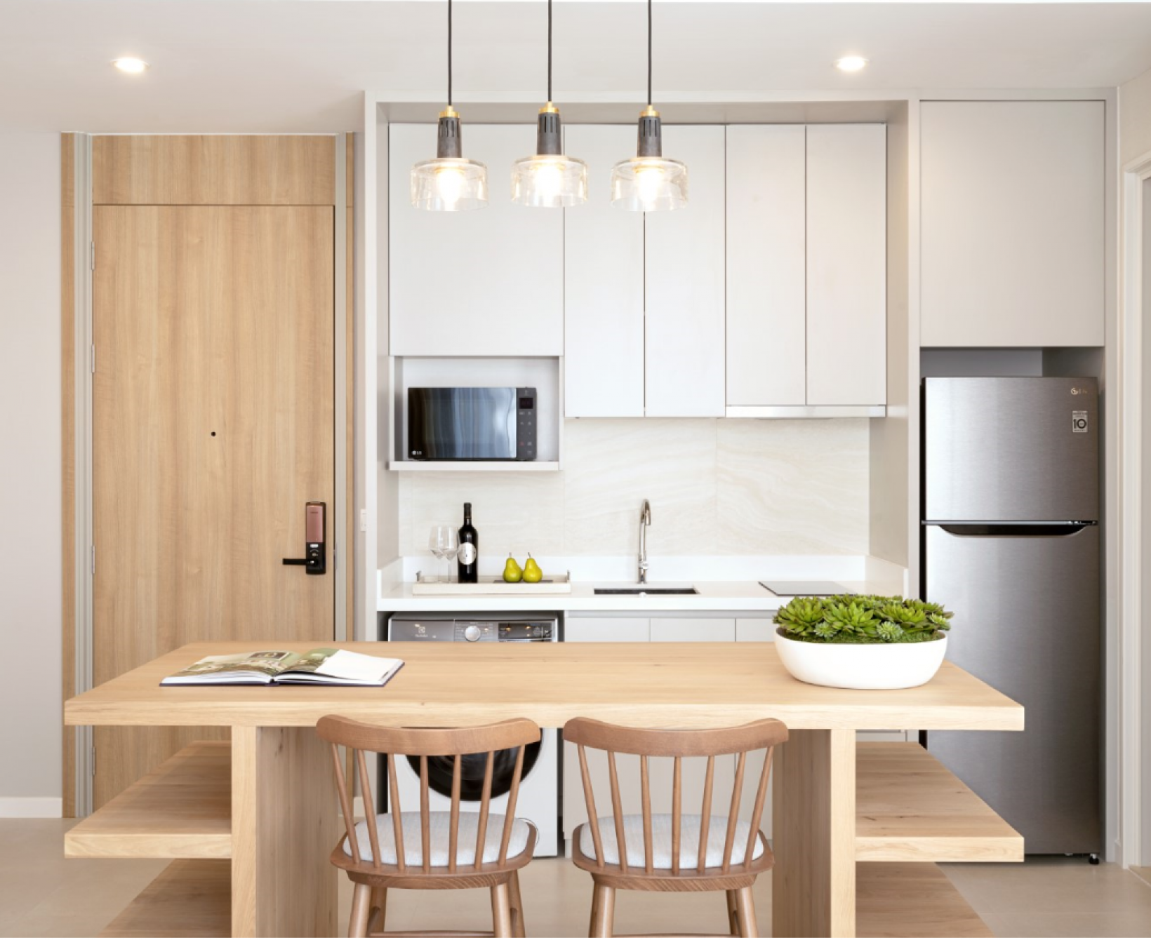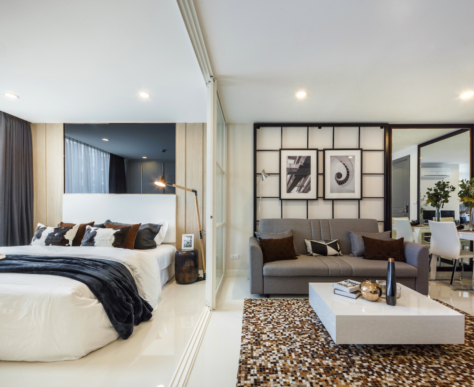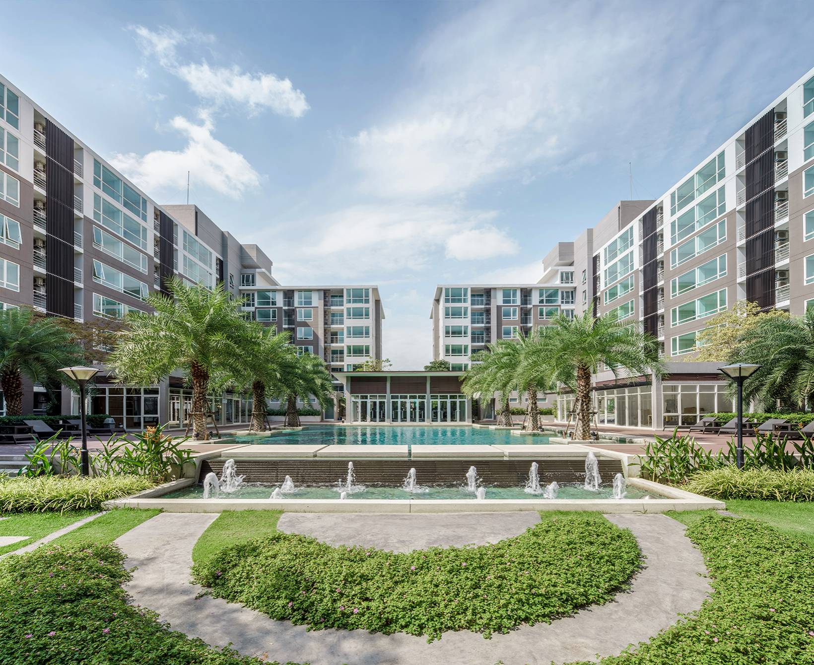 The development’s innovative design optimizes build density while emphasizing the outdoors, creating an abundance of green spaces usually reserved for larger estates. Daily life in the neighborhood is facilitated by nearby universities, hospitals, department stores, and markets, while the Suvarnabhumi International airport link provides access to two other mass transit routes, conveniently connecting residents with the rest of the city.